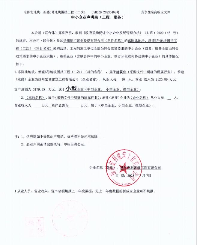 五、評(píng)審專家名單:宋偉、陸曉萍、陳玉龍 六、代理服務(wù)收費(fèi)標(biāo)準(zhǔn)及金額:4200元收取 七、公告期限 自本公告發(fā)布之日起1個(gè)工作日。 八、其他補(bǔ)充事宜:無 九、凡對(duì)本次公告內(nèi)容提出詢問,請(qǐng)按以下方式聯(lián)系。 1.采購人信息 名 稱:揚(yáng)州錦匯置業(yè)投資有限公司 地 址:揚(yáng)州市 聯(lián)系方式:0514-82120352 2.采購代理機(jī)構(gòu)信息 名 稱:江蘇匯誠投資咨詢管理有限公司 地 址:揚(yáng)州市邗江北路68號(hào)3樓 聯(lián) 系 人:張靜 聯(lián)系電話:18752727498 3.項(xiàng)目聯(lián)系方式 項(xiàng)目聯(lián)系人:張靜 電 話:18752727498 2023年7月7日 中小企業(yè)聲明函.jpg