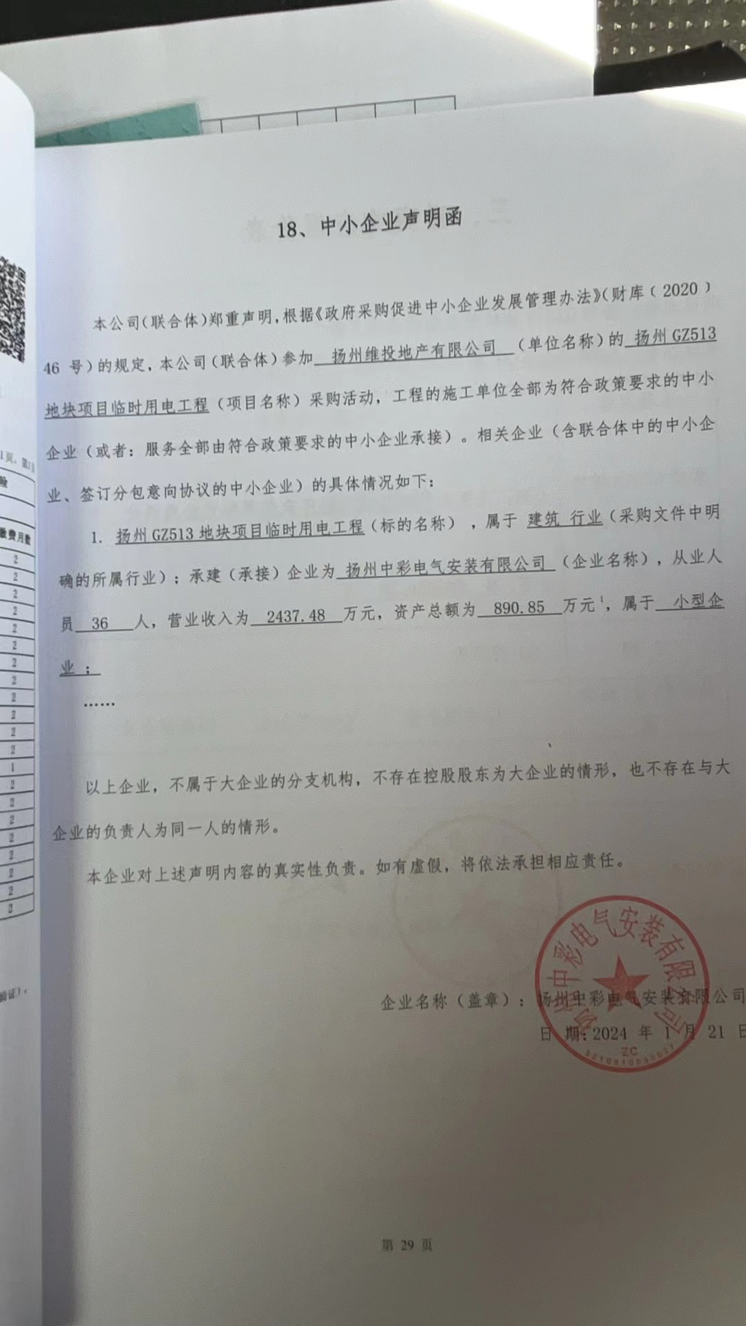 五、評審專家名單:楊坤、戴海華、徐靜雯 六、公告期限 自本公告發(fā)布之日起1個(gè)工作日。 七、其他補(bǔ)充事宜 無 八、凡對本次公告內(nèi)容提出詢問,請按以下方式聯(lián)系。 1.采購人信息 名 稱:揚(yáng)州維投地產(chǎn)有限公司 2.采購代理機(jī)構(gòu)信息 名 稱:揚(yáng)州筑苑工程招標(biāo)咨詢有限公司 地 址:揚(yáng)州潤揚(yáng)北路19號 聯(lián) 系 人:李斌 聯(lián)系電話:0514-87116778 3.項(xiàng)目聯(lián)系方式 項(xiàng)目聯(lián)系人:李斌 電 話:0514-87116778 揚(yáng)州筑苑工程招標(biāo)咨詢有限公司 2024年1月23日 中小企業(yè)聲明函.jpg