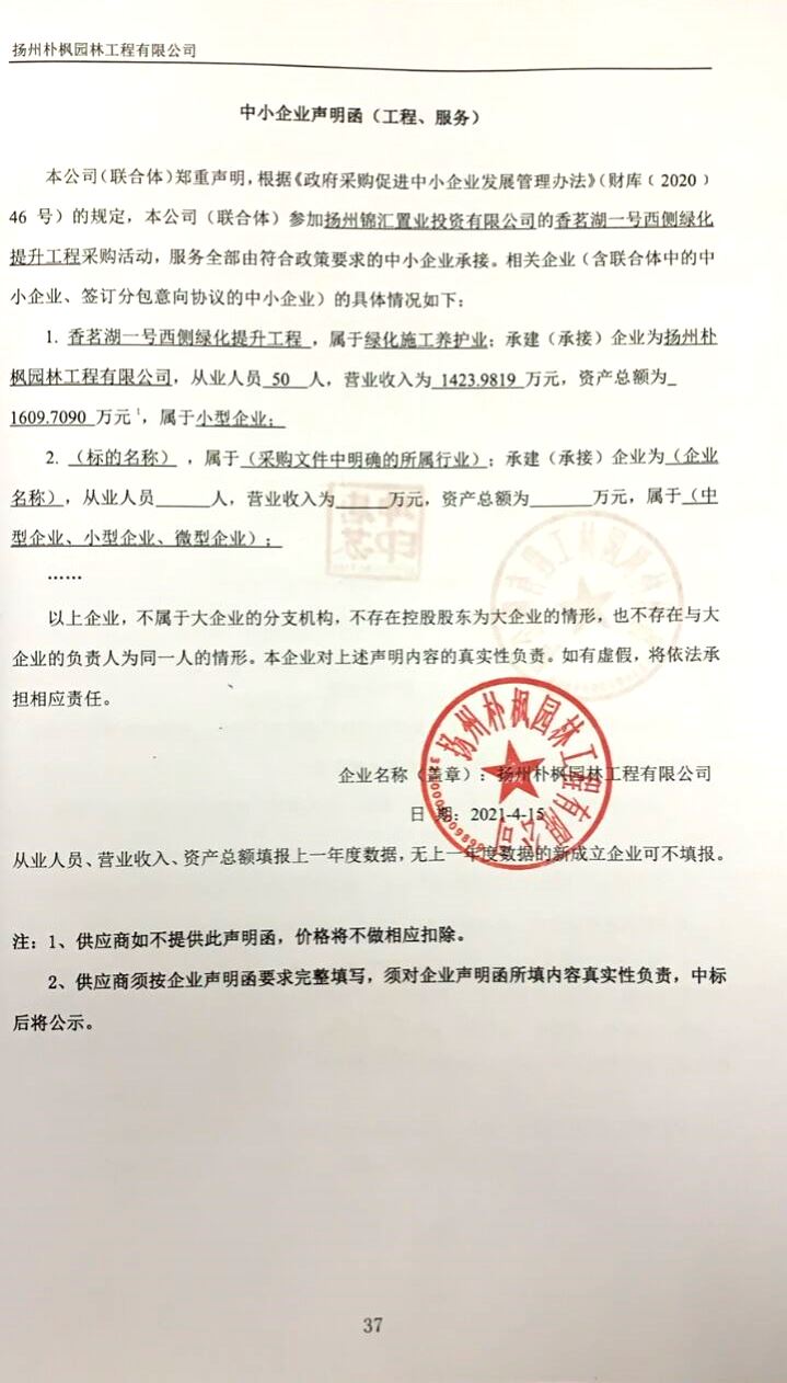 五、評審專家名單:朱健、孔繁龍、徐梅、徐亞萍、孫桂平 六、代理服務(wù)收費(fèi)標(biāo)準(zhǔn)及金額: 本項(xiàng)目按4200元支付采購代理費(fèi)用 七、公告期限 自本公告發(fā)布之日起1個(gè)工作日。 八、其他補(bǔ)充事宜 無 九、凡對本次公告內(nèi)容提出詢問,請按以下方式聯(lián)系。 1.采購人信息名 稱:揚(yáng)州錦匯置業(yè)投資有限公司 地 址:揚(yáng)州市邗江區(qū)潤揚(yáng)北路8號 聯(lián)系方式: 李工 0514-82120352 2.采購代理機(jī)構(gòu)信息 名 稱:揚(yáng)州筑苑工程招標(biāo)咨詢有限公司 地 址:揚(yáng)州市瘦西湖路65號 聯(lián)系方式:0514-87116778 3.項(xiàng)目聯(lián)系方式項(xiàng)目聯(lián)系人:李斌 電 話:0514-87116778 附件:中小企業(yè)聲明函.jpg