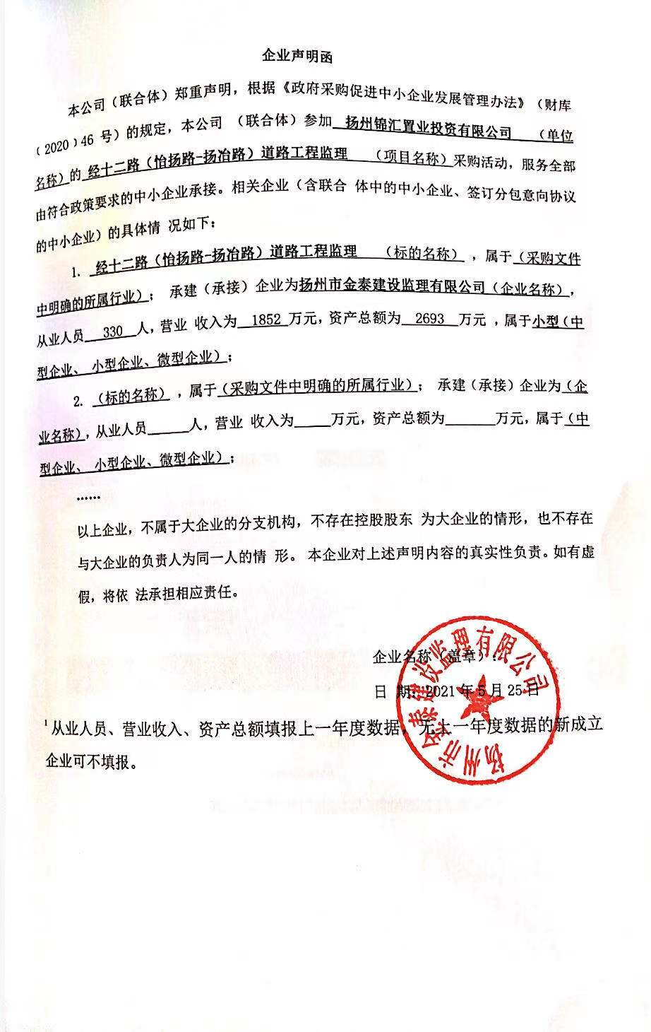 五、評審專家名單: 董學(xué)明 譚勇 徐梅 六、代理服務(wù)收費(fèi)標(biāo)準(zhǔn)及金額: 4200元 七、公告期限 自本公告發(fā)布之日起1個(gè)工作日。 八、其他補(bǔ)充事宜 無 九、凡對本次公告內(nèi)容提出詢問,請按以下方式聯(lián)系。 1.采購人信息名 稱: 揚(yáng)州錦匯置業(yè)投資有限公司 2.采購代理機(jī)構(gòu)信息名 稱:江蘇志誠工程咨詢管理有限公司 地 址:揚(yáng)州市文昌西路305號金都匯商務(wù)樓3樓 聯(lián) 系 人:耿帆 聯(lián)系電話:0514-80820678 3.項(xiàng)目聯(lián)系方式項(xiàng)目聯(lián)系人:耿帆 電 話:0514-80820678 企業(yè)聲明函.jpg