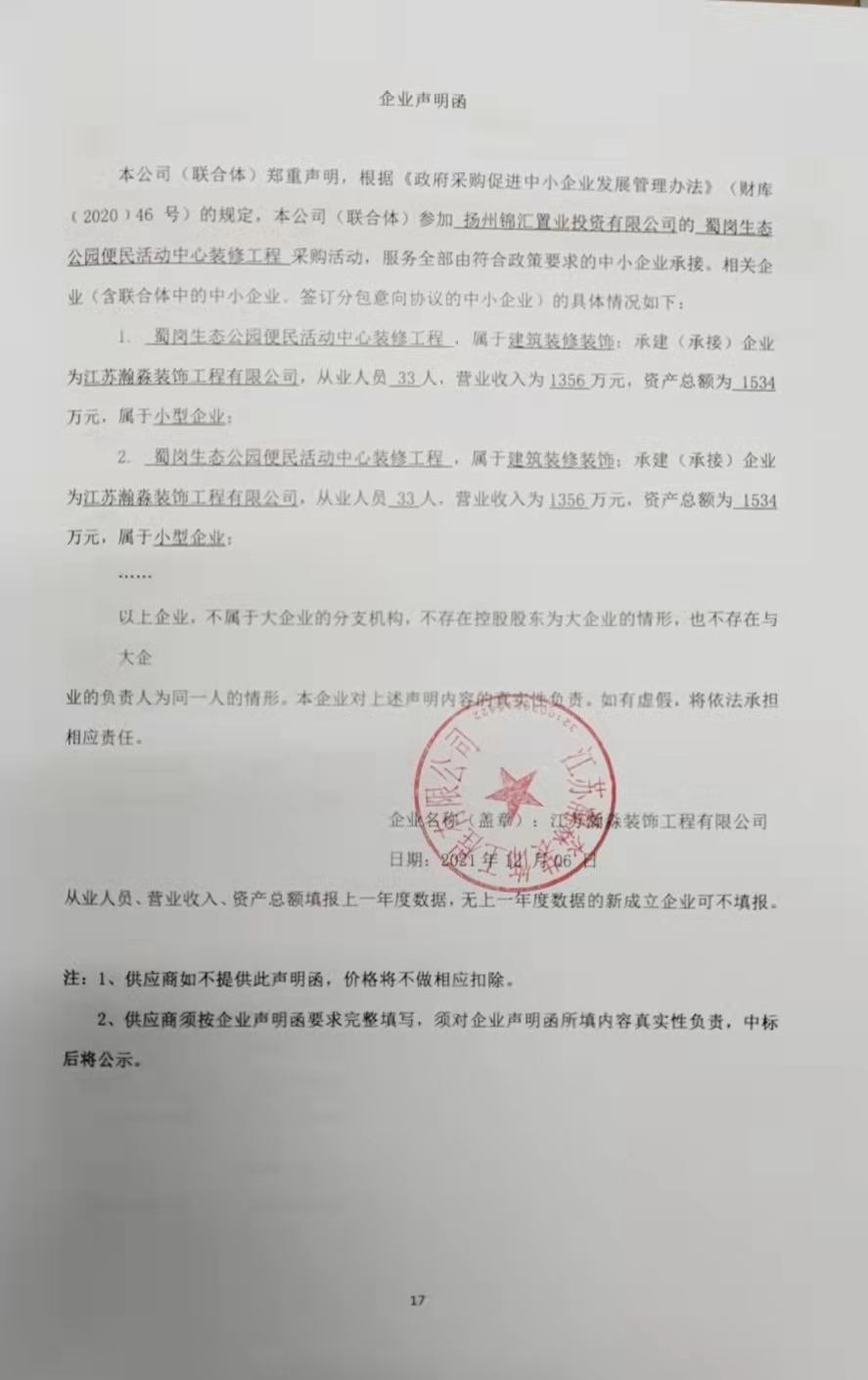 六、代理服務(wù)收費(fèi)標(biāo)準(zhǔn)及金額:本項(xiàng)目按4200元支付采購代理費(fèi)用。 七、公告期限 自本公告發(fā)布之日起1個(gè)工作日。 八、其他補(bǔ)充事宜 江蘇瀚淼裝飾工程有限公司為小型企業(yè)。 九、凡對本次公告內(nèi)容提出詢問,請按以下方式聯(lián)系。 1、采購人信息 名 稱:揚(yáng)州錦匯置業(yè)投資有限公司 2、采購代理機(jī)構(gòu)信息 名 稱: 南京金鼎工程造價(jià)評估有限責(zé)任公司揚(yáng)州分公司 地 址: 揚(yáng)州市邗江北路318號沿街商鋪4樓(經(jīng)圩人家飯店旁玻璃門上4樓) 聯(lián)系方式: 18762317185 3、項(xiàng)目聯(lián)系方式 項(xiàng)目聯(lián)系人: 王石磊 電 話: 18762317185 2021年12月7日 5cc010640b506219e18dc9dac6a82e0.jpg